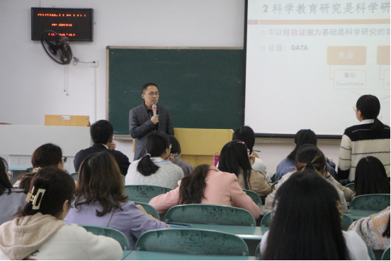 进行讲座,讲座主题为“科学教育研究与论文写作”,我院2020级学科教学(化学)专业全体研究生和部分本科生到场观摩学习。讲座由我院许应华教授主持。